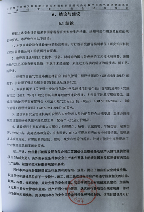 儀征磐石能源發(fā)展有限公司江蘇國信儀征燃機(jī)熱電聯(lián)產(chǎn)天然氣直供管道項(xiàng)目(改線變更),其外部安全條件和安全生產(chǎn)條件整體上能滿足國家及江蘇省有關(guān)安全生產(chǎn)法律、法規(guī)和技術(shù)標(biāo)準(zhǔn)的規(guī)定和要求 |