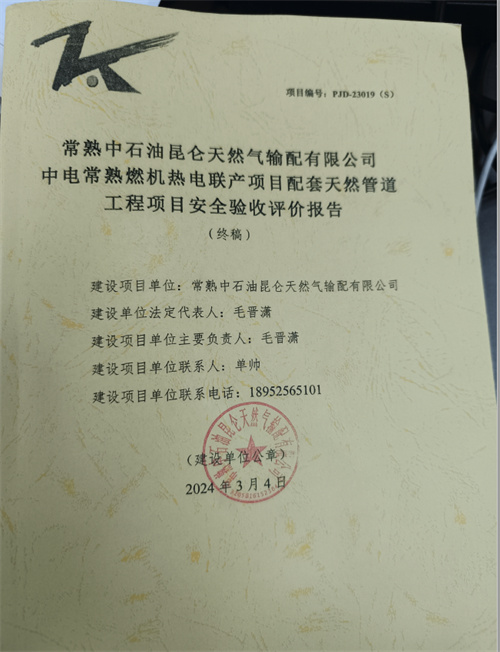 常熟中石油昆侖天然氣輸配有限公司中電常熟燃機(jī)熱電聯(lián)產(chǎn)項(xiàng)目配套天然管道工程項(xiàng)目安全設(shè)施竣工驗(yàn)收評(píng)價(jià)報(bào)告