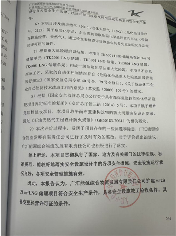 廣匯能源綜合物流發展有限責任公司擴建6#20萬m3LNG儲罐項目安全設施竣工驗收評價報告 |