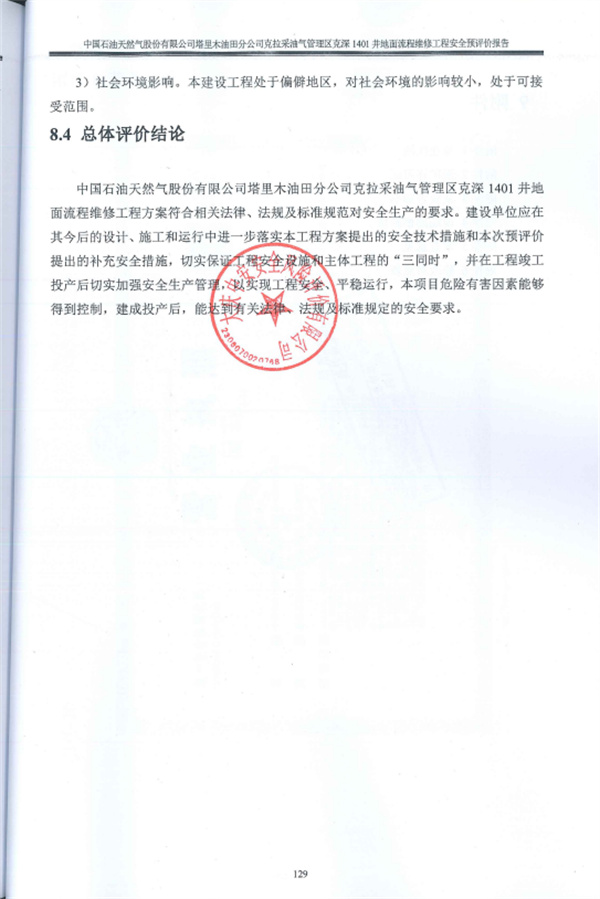 中國石油天然氣股份有限公司塔里木油田分公司克拉采油氣管理區克深1401井地面流程維修工程方案符合相關法律、法規及標準規范對安全生產的要求。建設單位應在其今后的設計、施工和運行中進一步落實本工程方案提出的安全技術措施和本次預評價提出的補充安全措施,切實保證工程安全設施和主體工程的“三同時”,并在工程竣工投產后切實加強安全生產管理,以實現工程安全、平穩運行,本項目危險有害因素能夠得到控制,建成投產后,能達到有關法律、法規及標準規定的安全要求。 |