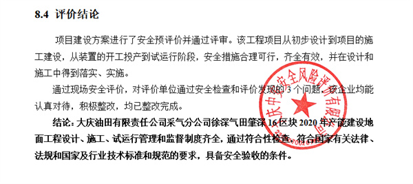 大慶油田有限責任公司采氣分公司徐深氣田肇深16區塊2020年產能建設地面工程設計、施工、試運行管理和監督制度齊全,通過符合性檢查,符合國家有關法律、法規和國家及行業技術標準和規范的要求,具備安全驗收的條件。 |