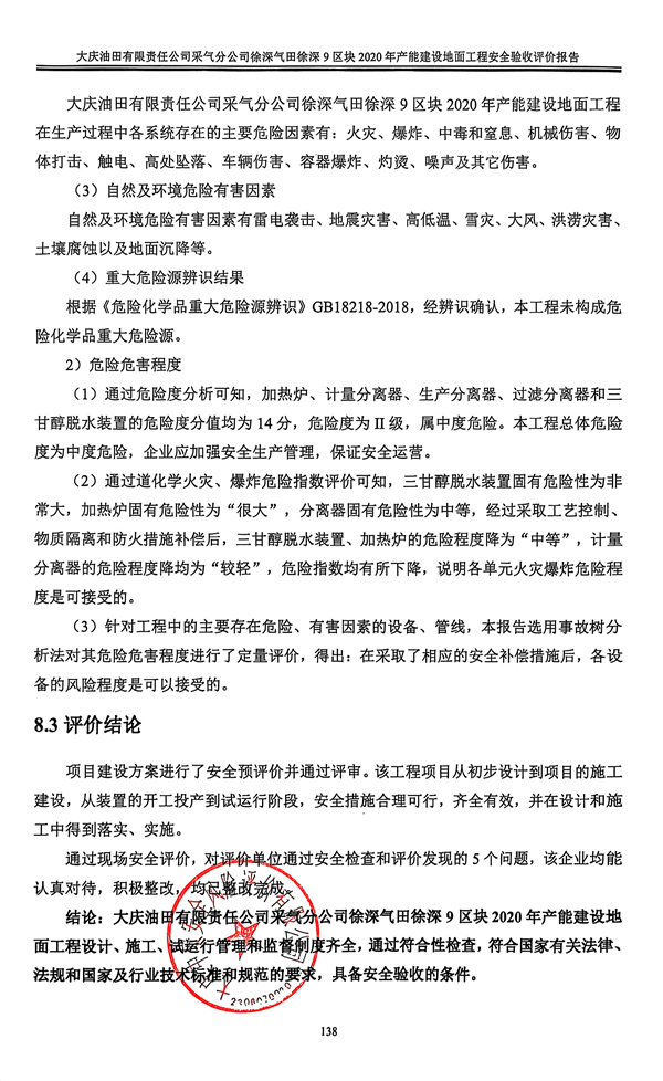 大慶油田有限責(zé)任公司采氣分公司徐深氣田徐深9區(qū)塊2020年產(chǎn)能建設(shè)地面工程安全驗(yàn)收評價(jià)報(bào)告 |