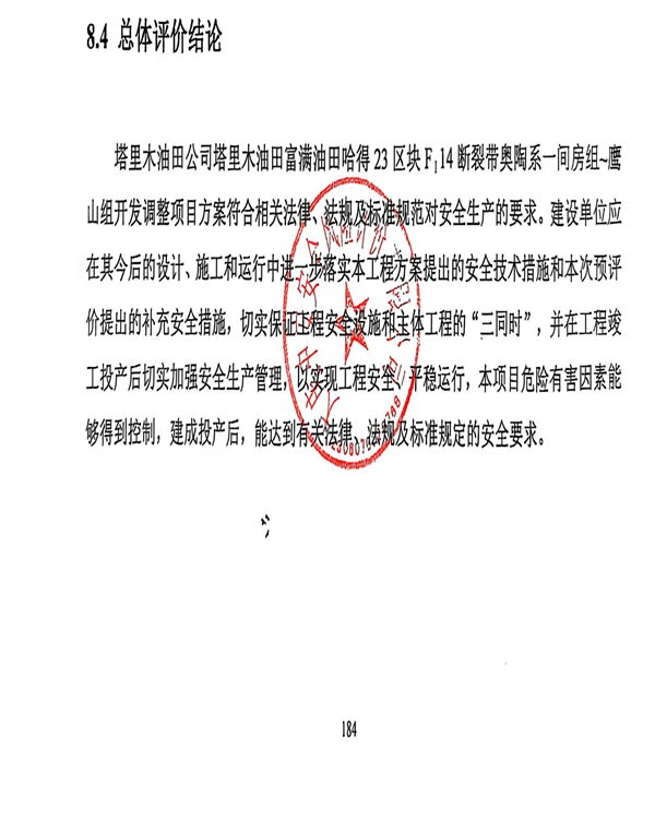 塔里木油田公司塔里木油田富滿油田哈得23區塊FⅠ14斷裂帶奧陶系一間房組~鷹山組開發調整項目方案符合相關法律、法規及標準規范對安全生產的要求。建設單位應在其今后的設計、施工和運行中進一步落實本工程方案提出的安全技術措施和本次預評價提出的補充安全措施,切實保證工程安全設施和主體工程的“三同時”,并在工程竣工投產后切實加強安全生產管理,以實現工程安全、平穩運行,本項目危險有害因素能夠得到控制,建成投產后,能達到有關法律、法規及標準規定的安全要求。 |