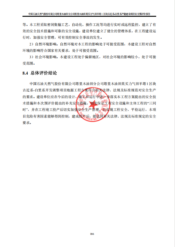 中國石油天然氣股份有限公司塔里木油田分公司塔里木油田英買力氣田羊塔1區(qū)塊古近系-白堊系開發(fā)調(diào)整項目地面工程方案符合相關法律、法規(guī)及標準規(guī)范對安全生產(chǎn)的要求。建設單位應在今后的設計、施工和運行中進一步落實本工程方案提出的安全技術措施和本次預評價提出的補充安全措施,切實保證工程安全設施和主體工程的“三同時”,并在工程竣工投產(chǎn)后切實加強安全生產(chǎn)管理,以實現(xiàn)工程安全、平穩(wěn)運行,本項目危險有害因素能夠得到控制,建成投產(chǎn)后,能達到有關法律、法規(guī)及標準規(guī)定的安全要求。 |
