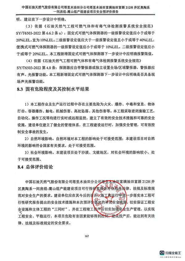 中國石油天然氣股份有限公司塔里木油田分公司塔里木油田富滿油田富源212H井區(qū)奧陶系一間房組-鷹山組產(chǎn)能建設(shè)項(xiàng)目可行性研究報(bào)告符合相關(guān)法律、法規(guī)及標(biāo)準(zhǔn)規(guī)范對安全生產(chǎn)的要求。建設(shè)單位應(yīng)在其今后的設(shè)計(jì)、施工和運(yùn)行中進(jìn)一步落實(shí)本工程可行性研究報(bào)告提出的安全技術(shù)措施和本次預(yù)評價提出的補(bǔ)充安全措施,切實(shí)保證工程安全設(shè)施和主體工程的“三同時”,并在工程竣工投產(chǎn)后切實(shí)加強(qiáng)安全生產(chǎn)管理,以實(shí)現(xiàn)工程安全、平穩(wěn)運(yùn)行,本項(xiàng)目危險(xiǎn)有害因素能夠得到控制,建成投產(chǎn)后,能達(dá)到有關(guān)法律、法規(guī)及標(biāo)準(zhǔn)規(guī)定的安全要求。 |