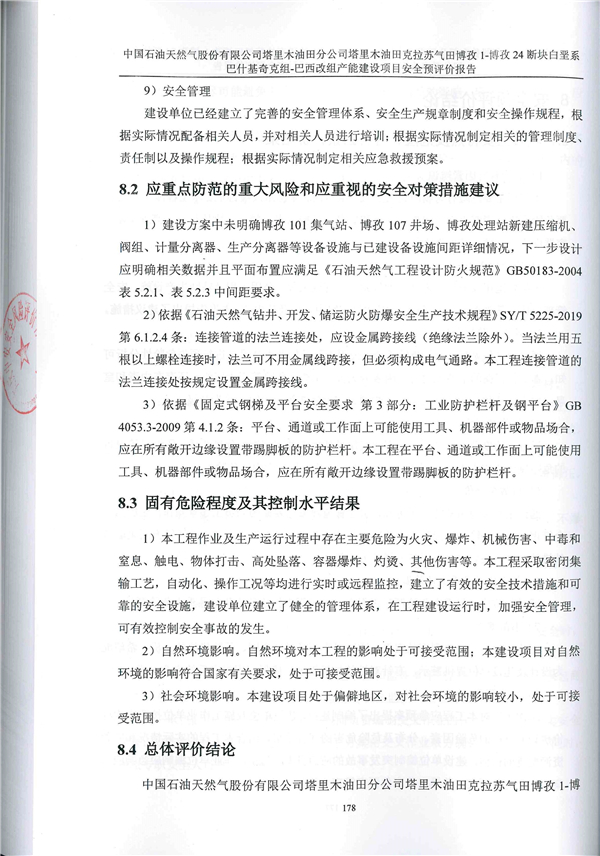 中國石油天然氣股份有限公司塔里木油田分公司塔里木油田克拉蘇氣田博孜1-博孜24斷塊白堊系巴什基奇克組-巴西改組產(chǎn)能建設(shè)項目建設(shè)方案符合相關(guān)法律、法規(guī)及標準規(guī)范對安全生產(chǎn)的要求。建設(shè)單位應在其今后的設(shè)計、施工和運行中進一步落實本工程方案提出的安全技術(shù)措施和本次預評價提出的補充安全措施,切實保證工程安全設(shè)施和主體工程的“三同時”,并在工程竣工投產(chǎn)后切實加強安全生產(chǎn)管理,以實現(xiàn)工程安全、平穩(wěn)運行,本項目危險有害因素能夠得到控制,建成投產(chǎn)后,能達到有關(guān)法律、法規(guī)及標準規(guī)定的安全要求。 |