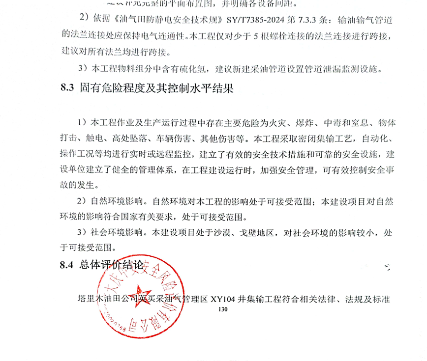 塔里木油田公司英買采油氣管理區XY104井集輸工程符合相關法律、法規及標準規范對安全生產的要求。建設單位應在今后的設計、施工和運行中進一步落實本工程方案提出的安全技術措施和本次預評價提出的補充安全措施,切實保證工程安全設施和主體工程的“三同時”,并在工程竣工投產后切實加強安全生產管理,以實現工程安全、平穩運行,本項目危險有害因素能夠得到控制,建成投產后,能達到有關法律、法規及標準規定的安全要求。 |