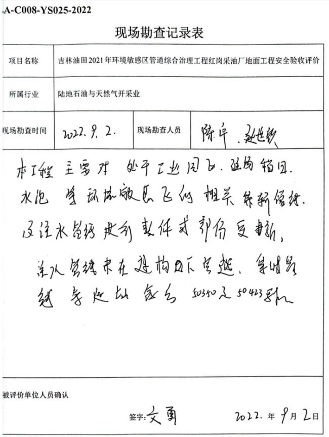 吉林油田2021年環(huán)境敏感區(qū)管道綜合治理工程紅崗采油廠地面工程設(shè)計、施工、試運行、安全管理和監(jiān)督制度齊全,安全設(shè)施與主體工程同時設(shè)計、同時施工、同時投入生產(chǎn),滿足“三同時”的要求,經(jīng)過符合性檢查,符合法律、法規(guī)和標準規(guī)范的要求,具備安全驗收條件。 |