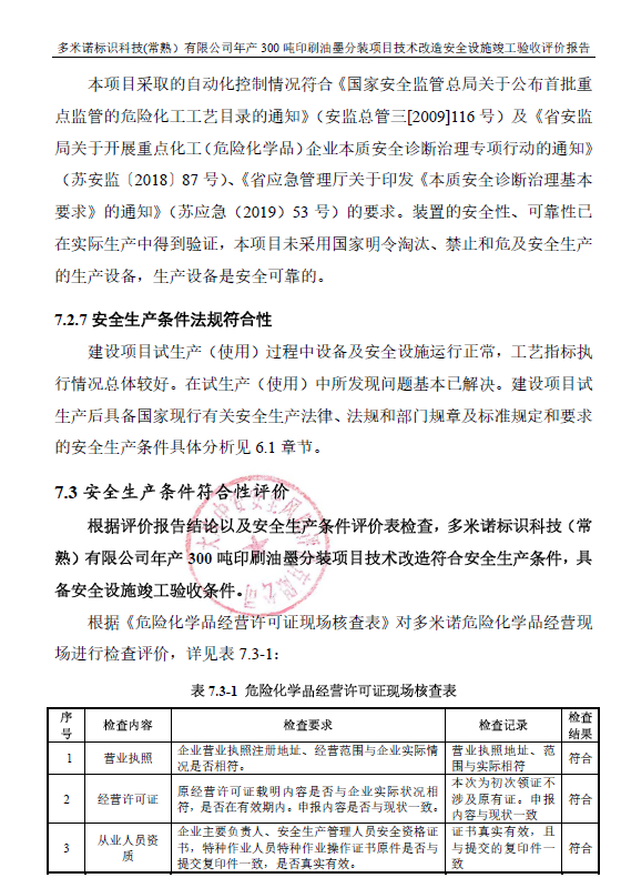 多米諾標(biāo)識科技(常熟)有限公司年產(chǎn)300噸印刷油墨分裝項(xiàng)目技術(shù)改造符合安全生產(chǎn)條件,具備安全設(shè)施竣工驗(yàn)收條件 |