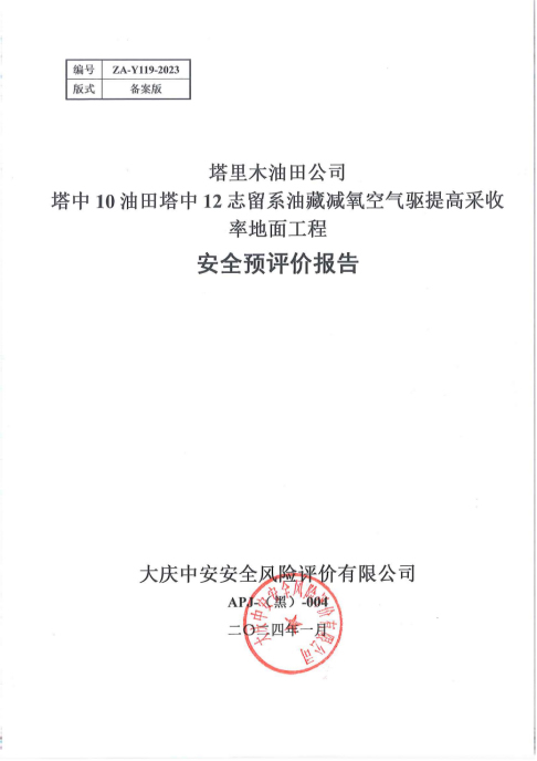 塔里木油田公司塔中10油田塔中12志留系油藏減氧空氣驅提高采收率地面工程 安全預評價