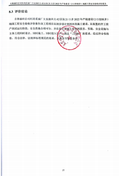 吉林油田公司紅崗采油廠大安油田大42區塊21口井2022年產能建設(2口控制井)地面工程安全驗收評價報告該工程項目從初步設計到項目的施工建設,從裝置的開工投產到試運行階段,安全措施合理可行,并在設計和施工中得到落實、實施,安全設施與主體工程同時設計、同時施工、同時投入生產,滿足“三同時”的要求,經過符合性檢查,符合法律、法規和標準規范的要求,具備安全驗收條件。。 |