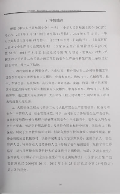 大慶鉆探工程公司鉆井二公司于2020年09月09日取得黑龍江省應急管理廳頒發的非煤礦山企業安全生產許可證延期換證,許可范圍:鉆井,許可證編號:黑FM安許證字[2020]DQ0020號。自2020年安全生產許可證延期換證至今,近三年生產過程中未發生重大傷亡事故。通過以上分析評價,本報告認為大慶鉆探工程公司鉆井二公司鉆井施工項目符合安全生產條件的要求。 |