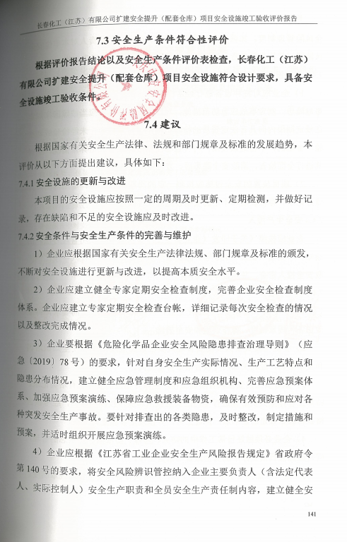 長春化工(江蘇)有限公司擴建安全提升(配套倉庫)項目安全設施竣工驗收評價報告 |