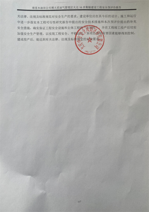 塔里木油田公司博大采油氣管理區大北16井集輸建設工程可行性研究報告符合相關法律、法規及標準規范對安全生產的要求。建設單位應在其今后的設計、施工和運行中進一步落實本工程可行性研究報告中提出的安全技術措施和本次預評價提出的補充安全措施,確實保證工程安全設施和主體工程的“三同時”,并在工程竣工投產后切實加強安全生產管理,以實現工程安全、平穩運行,本項目危險有害因素能夠得到控制,建成投產后,能達到有關法律、法規及標準規定的安全要求。 |