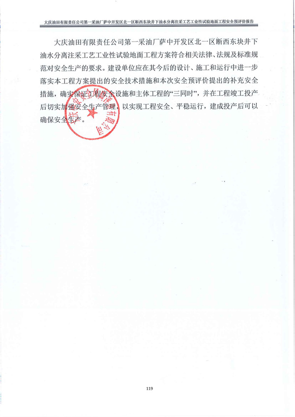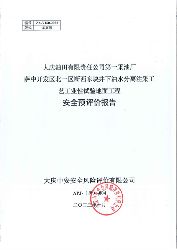 大慶油田有限責(zé)任公司第一采油廠薩中開發(fā)區(qū)北一區(qū)斷西東塊井下油水分離注采工藝工業(yè)性試驗(yàn)地面工程安全預(yù)評(píng)價(jià)報(bào)告