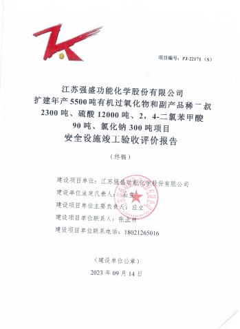 江蘇強盛功能化學股份有限公司擴建年產5500噸有機過氧化物 和副產品稀二叔2300噸、硫酸12000噸、2,4-二氯苯甲酸90噸、氯化鈉300噸項目安全設施竣工驗收評價報告 |
