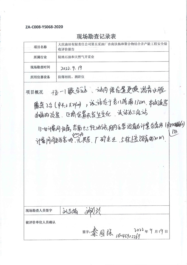 大慶油田有限責任公司第五采油廠杏南扶楊和聚合物結合井產能工程設計、施工、試運行管理和監督制度齊全,通過符合性檢查,符合國家有關法律、法規和國家及行業技術標準和規范的要求,整改完成后具備安全驗收的條件。 |